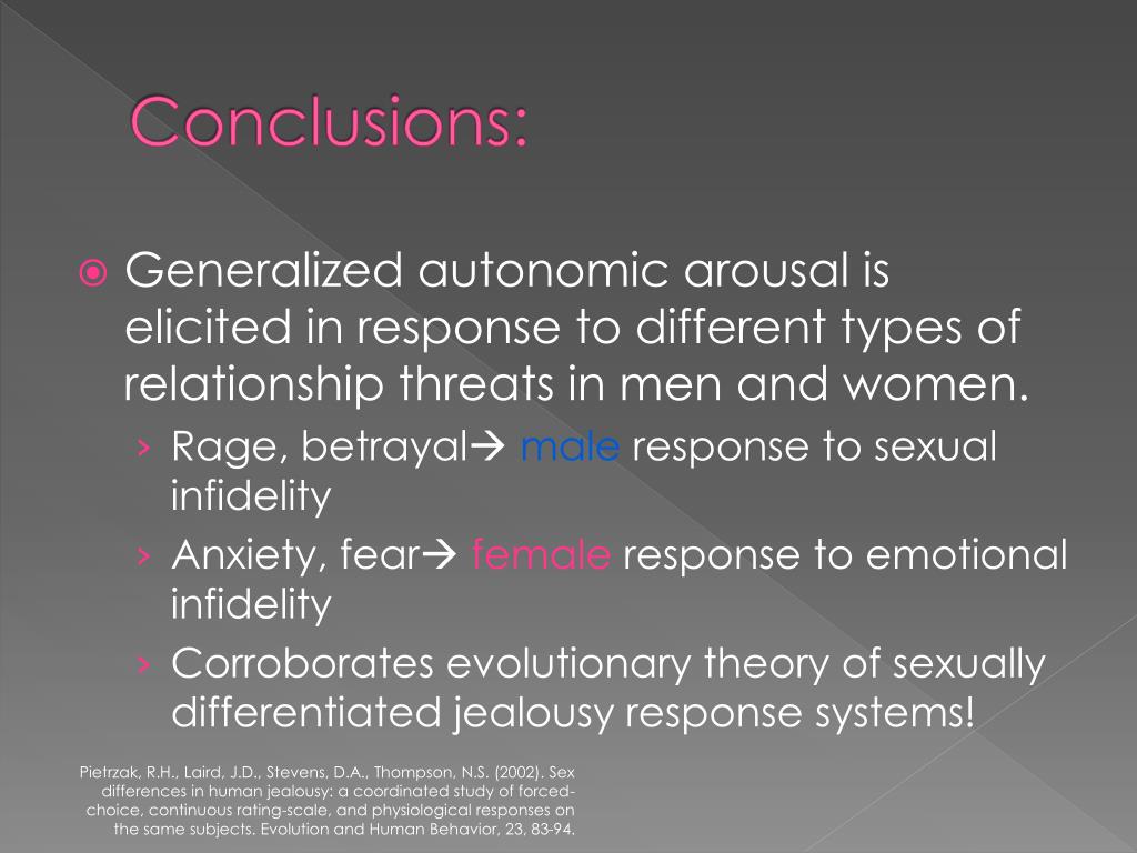 Conclusions: • Generalized autonomic arousal is elicited in response to different types of relationship threats in men and women. • Rage, betrayal male response to sexual infidelity • Anxiety, fear female response to emotional infidelity • Corroborates evolutionary theory of sexually differentiated jealousy response systems! Pietrzak, R.H., Laird, J.D., Stevens, D.A., Thompson, N.S. (2002). Sex differences in human jealousy: a coordinated study of forced-choice, continuous rating-scale, and physiological responses on the same subjects. Evolution and Human Behavior, 23, 83-94.