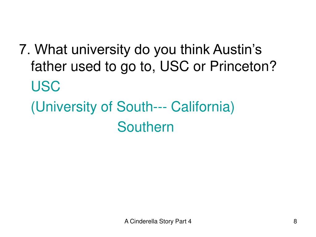 7. What university do you think Austin’s father used to go to, USC or Princeton? USC (University of South--- California) Southern A Cinderella Story Part 4