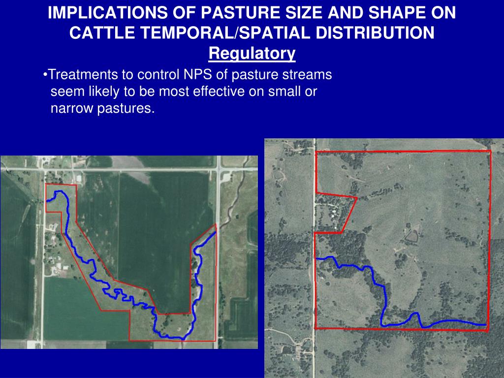 IMPLICATIONS OF PASTURE SIZE AND SHAPE ON CATTLE TEMPORAL/SPATIAL DISTRIBUTIONRegulatory • Treatments to control NPS of pasture streams • seem likely to be most effective on small or • narrow pastures.