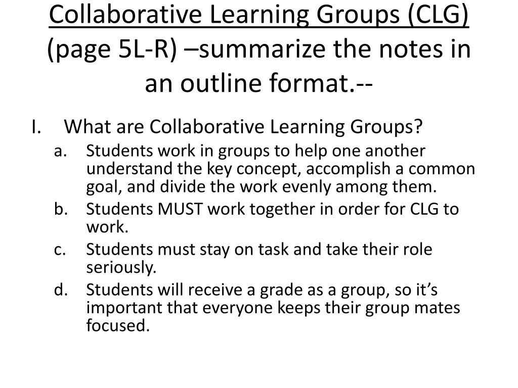 Collaborative Learning Groups (CLG) (page 5L-R) –summarize the notes in an outline format.-- • What are Collaborative Learning Groups? • Students work in groups to help one another understand the key concept, accomplish a common goal, and divide the work evenly among them. • Students MUST work together in order for CLG to work. • Students must stay on task and take their role seriously. • Students will receive a grade as a group, so it’s important that everyone keeps their group mates focused.