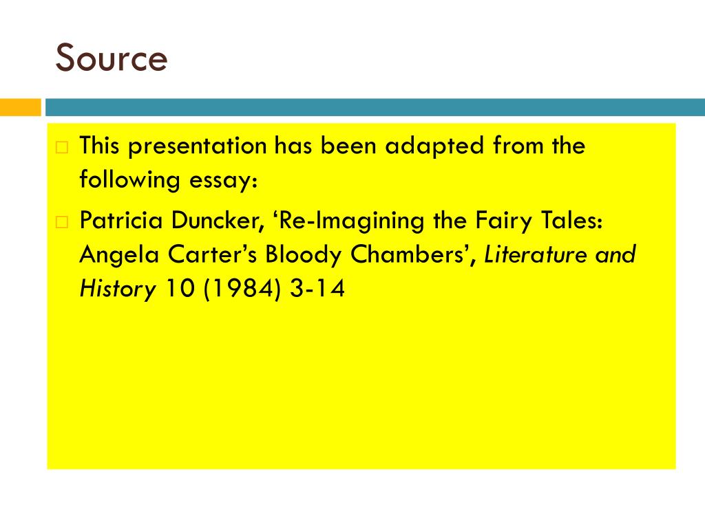 Source • This presentation has been adapted from the following essay: • Patricia Duncker, ‘Re-Imagining the Fairy Tales: Angela Carter’s Bloody Chambers’, Literature and History 10 (1984) 3-14