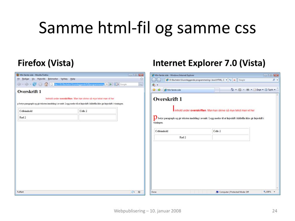 Samme html-fil og samme css Firefox (Vista) Internet Explorer 7.0 (Vista) Webpublisering – 10. januar 2008