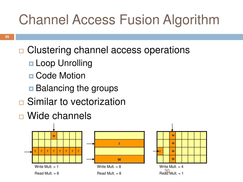 Channel Access Fusion Algorithm w w 30 r w • Clustering channel access operations • Loop Unrolling • Code Motion • Balancing the groups • Similar to vectorization • Wide channels r r r r r r r r r w w w Write Mult. = 1 Read Mult. = 8 Write Mult. = 8 Read Mult. = 8 Write Mult. = 4 Read Mult. = 1