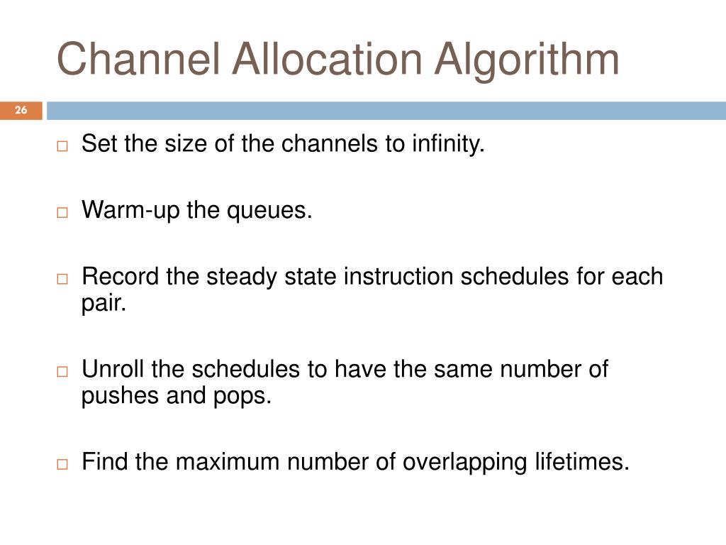 Channel Allocation Algorithm • Set the size of the channels to infinity. • Warm-up the queues. • Record the steady state instruction schedules for each pair. • Unroll the schedules to have the same number of pushes and pops. • Find the maximum number of overlapping lifetimes.