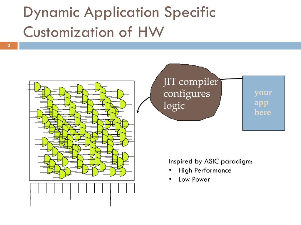 Dynamic Application Specific Customization of HW JIT compiler configures logic your app here • Inspired by ASIC paradigm: • High Performance • Low Power