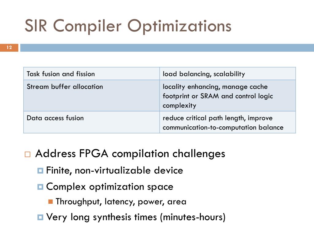 SIR Compiler Optimizations • Address FPGA compilation challenges • Finite, non-virtualizable device • Complex optimization space • Throughput, latency, power, area • Very long synthesis times (minutes-hours)