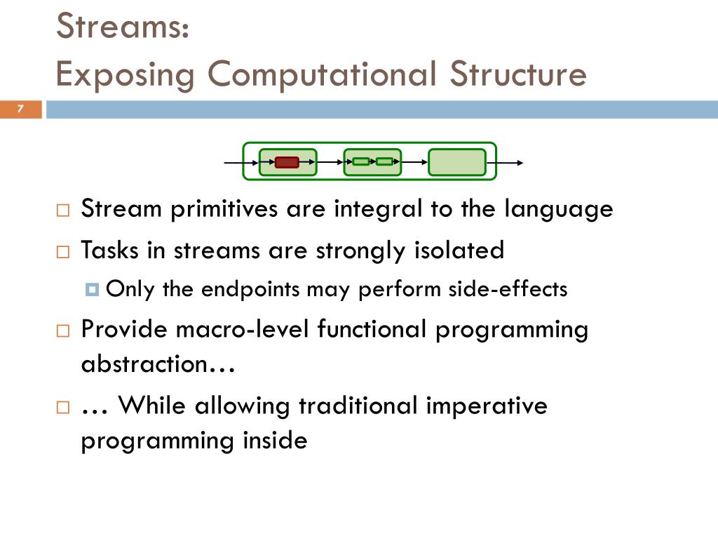 Streams: Exposing Computational Structure • Stream primitives are integral to the language • Tasks in streams are strongly isolated • Only the endpoints may perform side-effects • Provide macro-level functional programming abstraction… • … While allowing traditional imperative programming inside