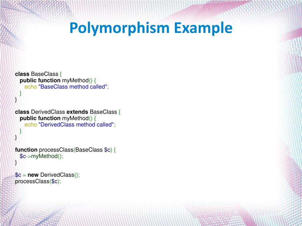 class BaseClass { publicfunction myMethod(){ echo"BaseClass method called"; } } class DerivedClass extends BaseClass { publicfunction myMethod(){ echo"DerivedClass method called"; } } function processClass(BaseClass $c){ $c->myMethod(); } $c=new DerivedClass(); processClass($c); Polymorphism Example