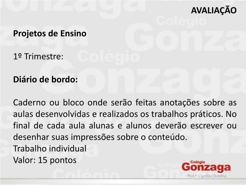 AVALIAÇÃO Projetos de Ensino 1º Trimestre: Diário de bordo: Caderno ou bloco onde serão feitas anotações sobre as aulas desenvolvidas e realizados os trabalhos práticos. No final de cada aula alunas e alunos deverão escrever ou desenhar suas impressões sobre o conteúdo. Trabalho individual Valor: 15 pontos Prof.ª Caroline Bonilha