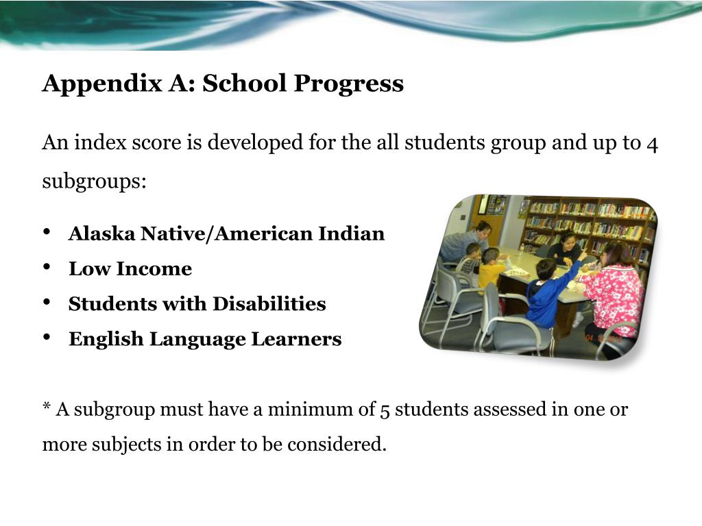Appendix A: School Progress An index score is developed for the all students group and up to 4 subgroups: • Alaska Native/American Indian • Low Income • Students with Disabilities • English Language Learners * A subgroup must have a minimum of 5 students assessed in one or more subjects in order to be considered.