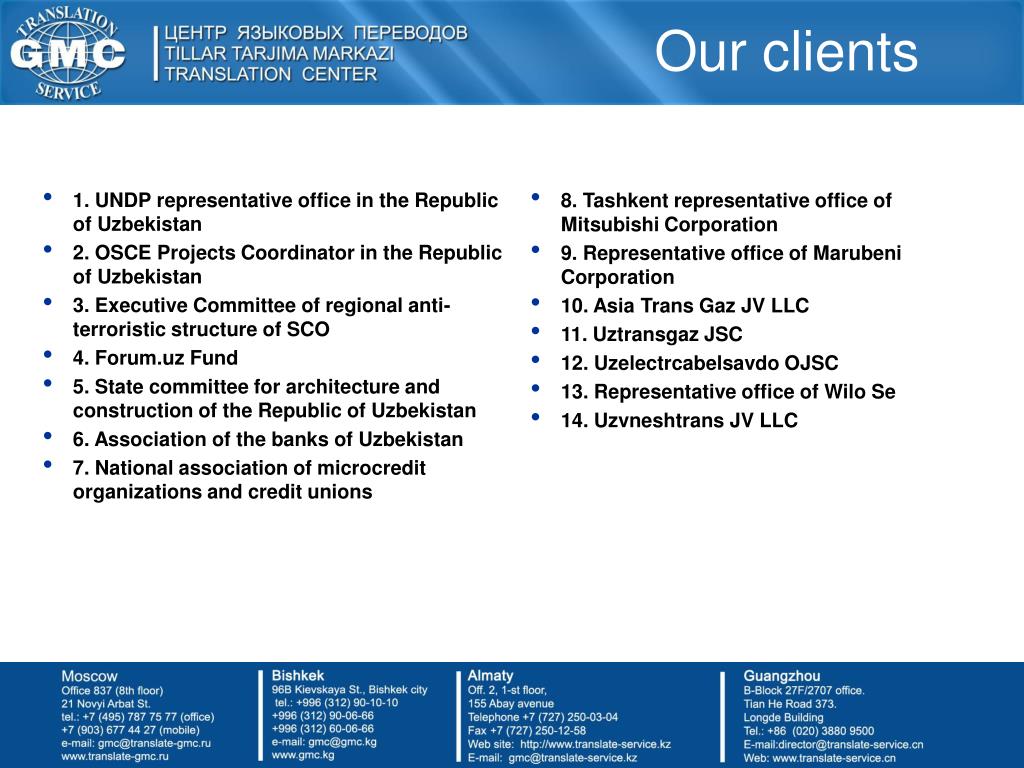 Our clients • 1. UNDP representative office in the Republic of Uzbekistan • 2. OSCE Projects Coordinator in the Republic of Uzbekistan • 3. Executive Committee of regional anti-terroristic structure of SCO • 4. Forum.uz Fund • 5. State committee for architecture and construction of the Republic of Uzbekistan • 6. Association of the banks of Uzbekistan • 7. National association of microcredit organizations and credit unions • 8. Tashkent representative office of Mitsubishi Corporation • 9. Representative office of Marubeni Corporation • 10. Asia Trans Gaz JV LLC • 11. Uztransgaz JSC • 12. Uzelectrcabelsavdo OJSC • 13. Representative office of Wilo Se • 14. Uzvneshtrans JV LLC.