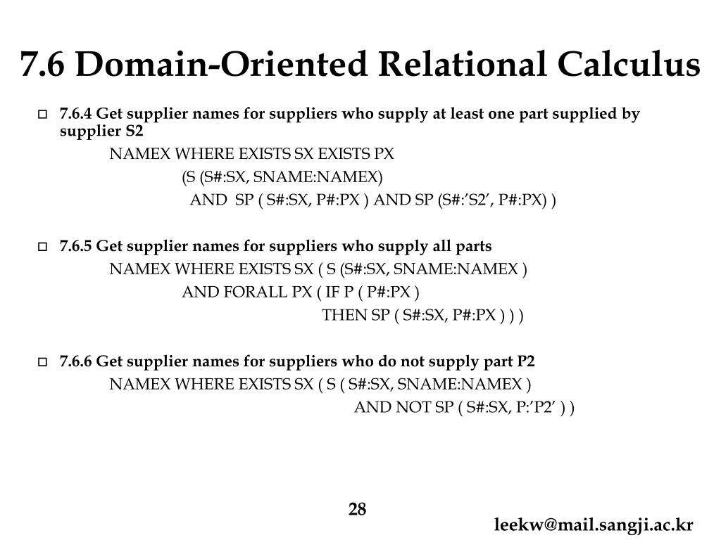 7.6 Domain-Oriented Relational Calculus • 7.6.4 Get supplier names for suppliers who supply at least one part supplied by supplier S2 NAMEX WHERE EXISTS SX EXISTS PX (S (S#:SX, SNAME:NAMEX) AND SP ( S#:SX, P#:PX ) AND SP (S#:’S2’, P#:PX) ) • 7.6.5 Get supplier names for suppliers who supply all parts NAMEX WHERE EXISTS SX ( S (S#:SX, SNAME:NAMEX ) AND FORALL PX ( IF P ( P#:PX ) THEN SP ( S#:SX, P#:PX ) ) ) • 7.6.6 Get supplier names for suppliers who do not supply part P2 NAMEX WHERE EXISTS SX ( S ( S#:SX, SNAME:NAMEX ) AND NOT SP ( S#:SX, P:’P2’ ) )