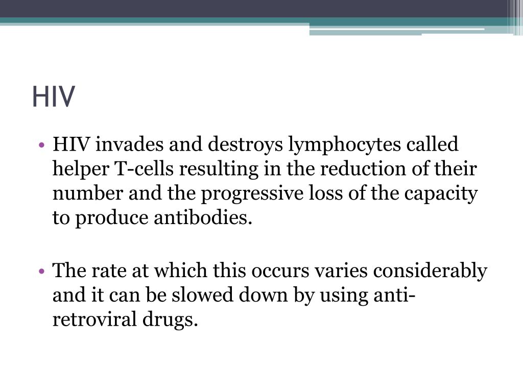 HIV • HIV invades and destroys lymphocytes called helper T-cells resulting in the reduction of their number and the progressive loss of the capacity to produce antibodies. • The rate at which this occurs varies considerably and it can be slowed down by using anti-retroviral drugs.