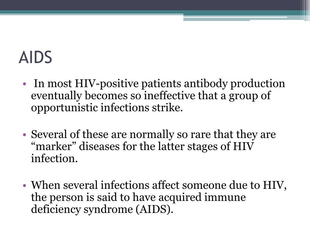 AIDS • In most HIV-positive patients antibody production eventually becomes so ineffective that a group of opportunistic infections strike. • Several of these are normally so rare that they are “marker” diseases for the latter stages of HIV infection. • When several infections affect someone due to HIV, the person is said to have acquired immune deficiency syndrome (AIDS).