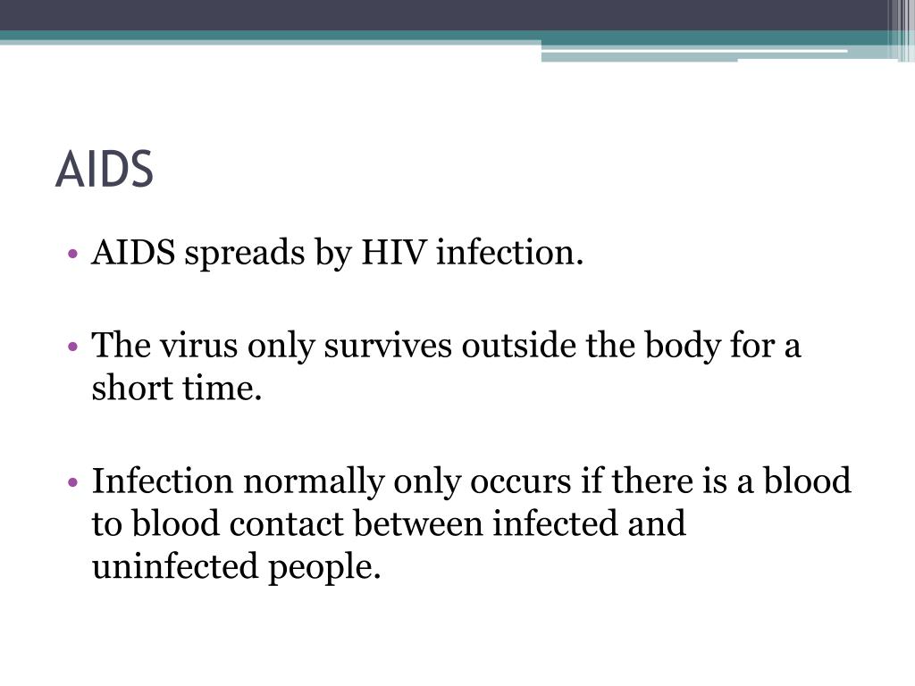 AIDS • AIDS spreads by HIV infection. • The virus only survives outside the body for a short time. • Infection normally only occurs if there is a blood to blood contact between infected and uninfected people.