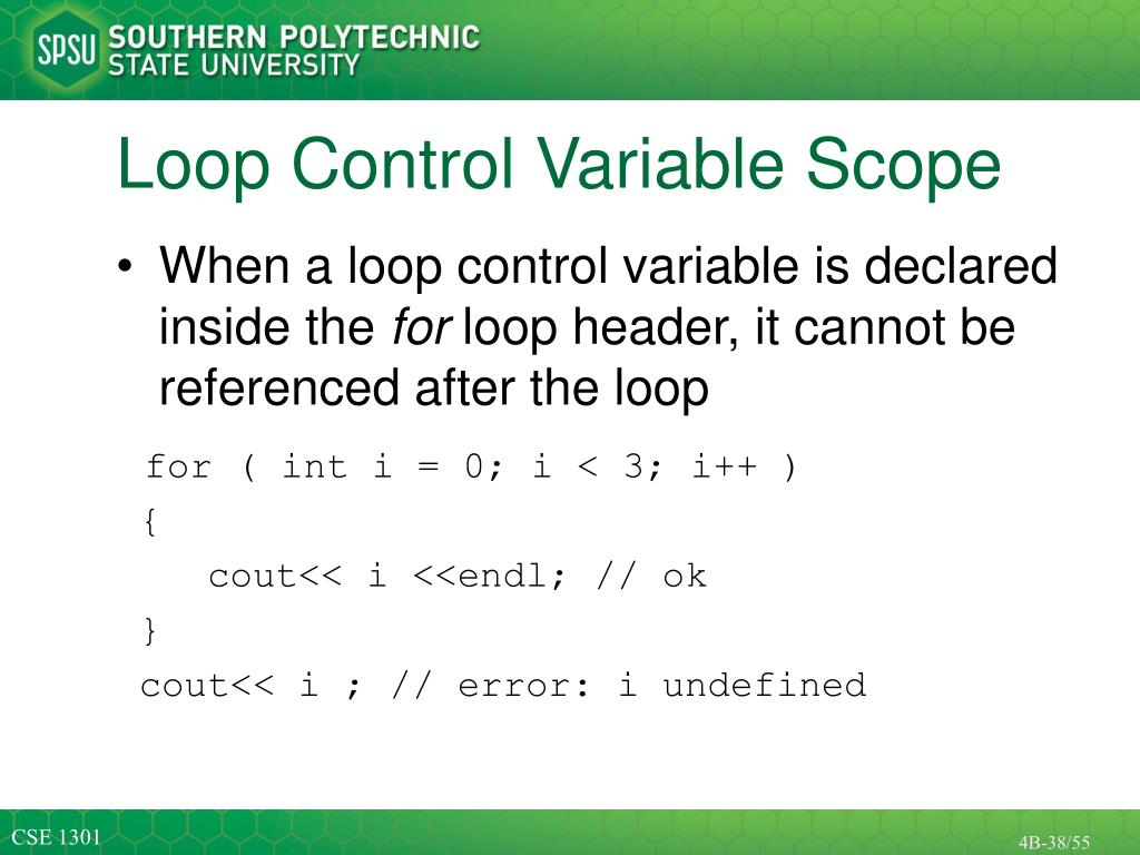 Loop Control Variable Scope When a loop control variable is declared inside the for loop header, it cannot be referenced after the loop for ( int i = 0; i < 3; i++ ) { cout<< i <<endl; // ok } cout<< i ; // error: i undefined