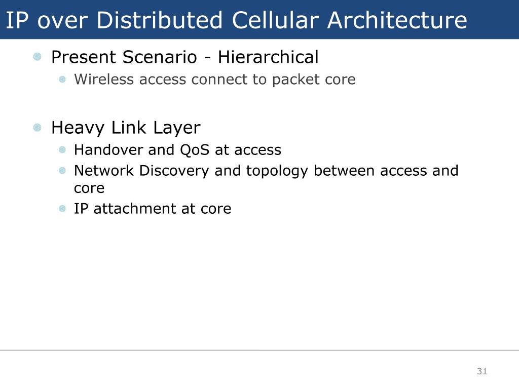 IP over Distributed Cellular Architecture • Present Scenario - Hierarchical • Wireless access connect to packet core • Heavy Link Layer • Handover and QoS at access • Network Discovery and topology between access and core • IP attachment at core