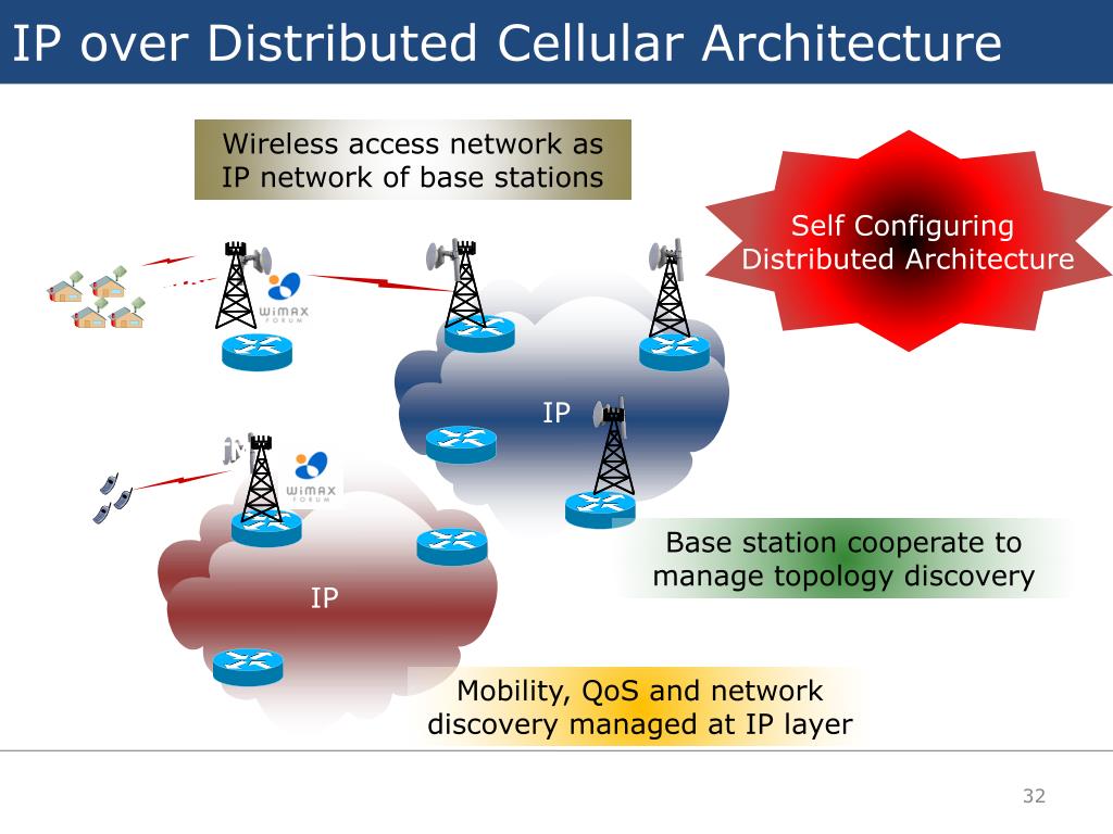 IP over Distributed Cellular Architecture Wireless access network as IP network of base stations Self Configuring Distributed Architecture TDM/ ATM/ IP / MPLS IP TDM/ ATM/ IP / MPLS Base station cooperate to manage topology discovery IP Mobility, QoS and network discovery managed at IP layer