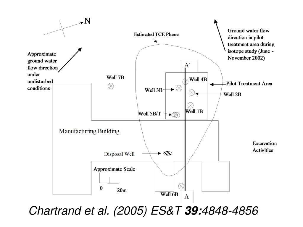 CSIA as Diagnostic Tool • Initial apparent successful production of VC and ethene • Confused and potentially compromised by fluctuations in hydrogeologic gradients • Periodic spikes in cisDCE & VC due to • Incomplete reductive dechlorination? • Dissolution (rebound) from NAPL phase? • Mixing of groundwater? Chartrand et al. (2005)