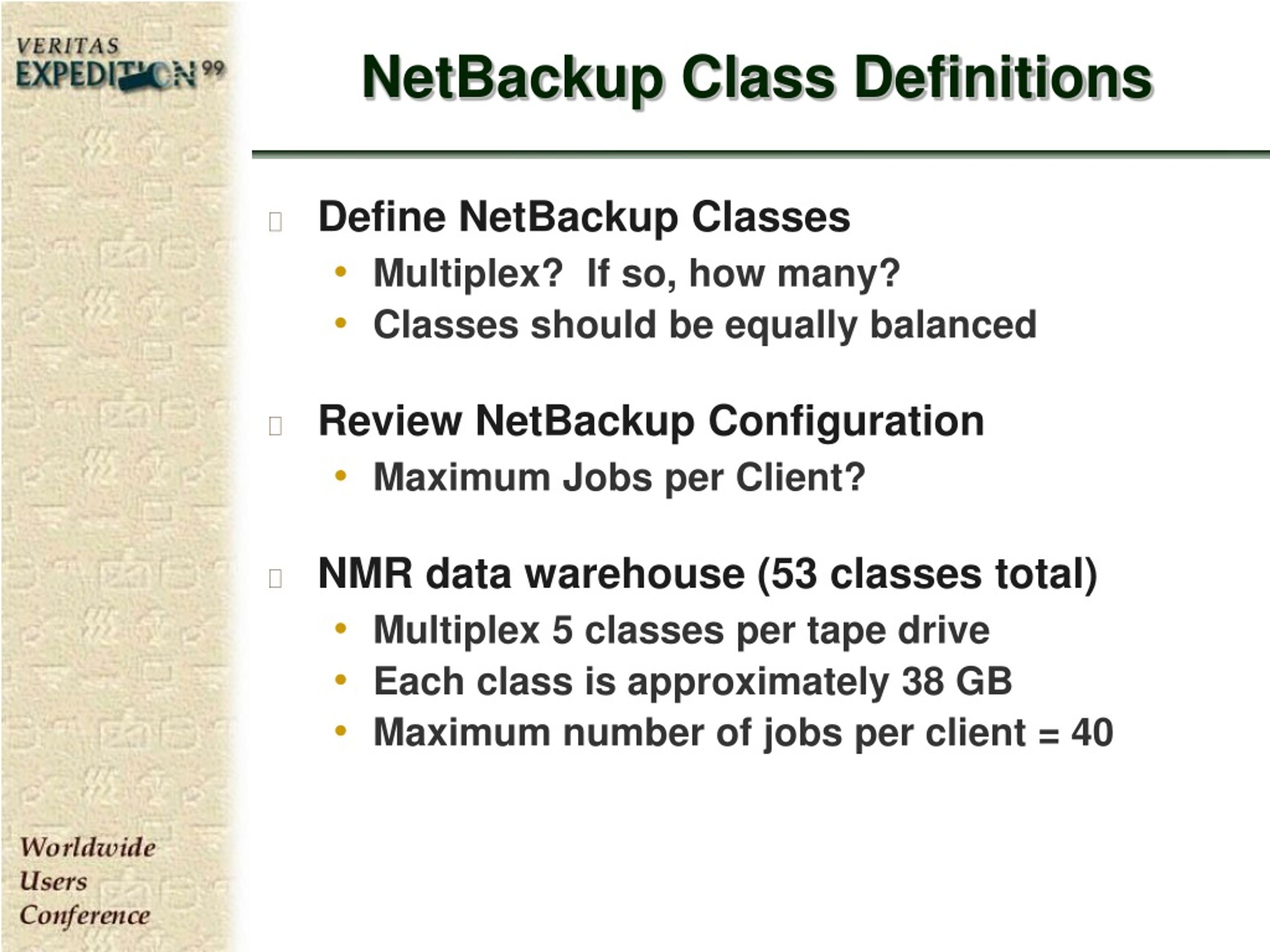 NetBackup Class Definitions • Define NetBackup Classes • Multiplex? If so, how many? • Classes should be equally balanced • Review NetBackup Configuration • Maximum Jobs per Client? • NMR data warehouse (53 classes total) • Multiplex 5 classes per tape drive • Each class is approximately 38 GB • Maximum number of jobs per client = 40