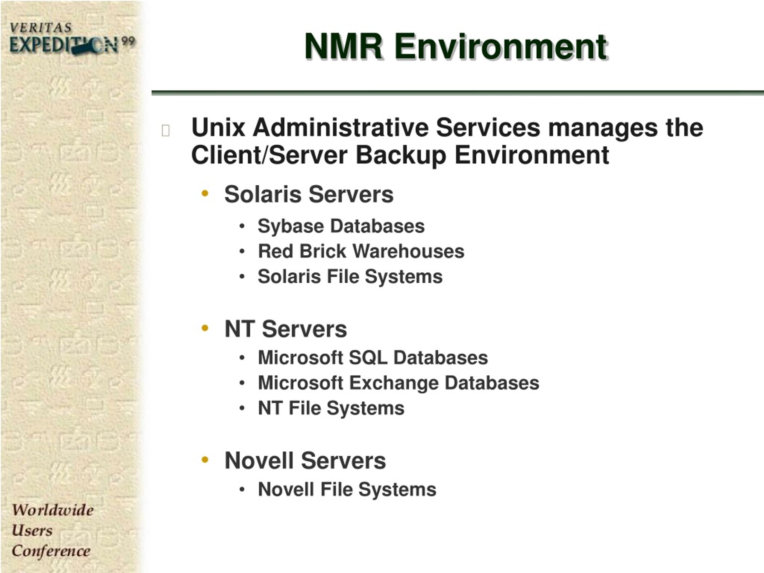 NMR Environment • Unix Administrative Services manages the Client/Server Backup Environment • Solaris Servers • Sybase Databases • Red Brick Warehouses • Solaris File Systems • NT Servers • Microsoft SQL Databases • Microsoft Exchange Databases • NT File Systems • Novell Servers • Novell File Systems