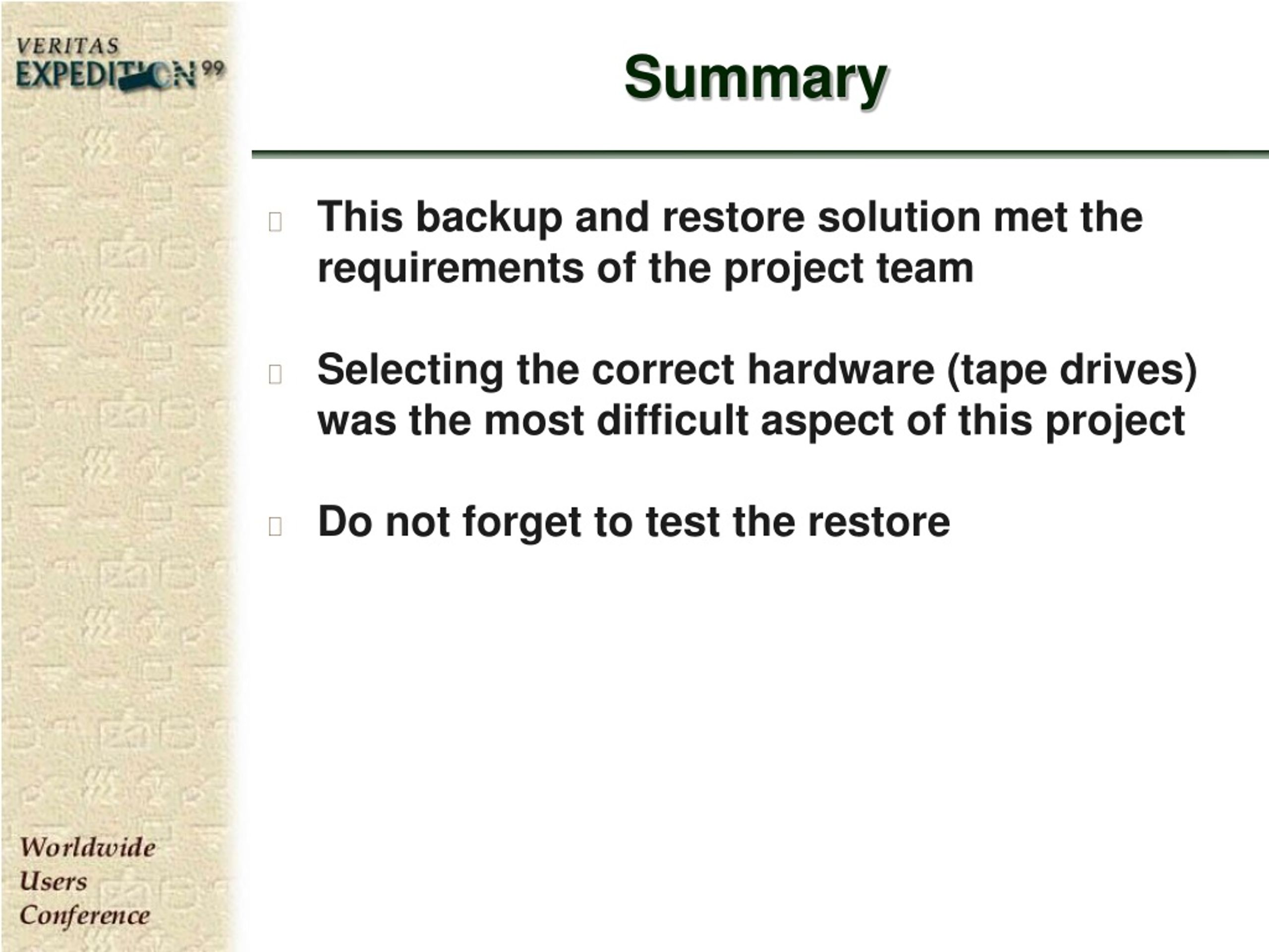 Summary • This backup and restore solution met the requirements of the project team • Selecting the correct hardware (tape drives) was the most difficult aspect of this project • Do not forget to test the restore