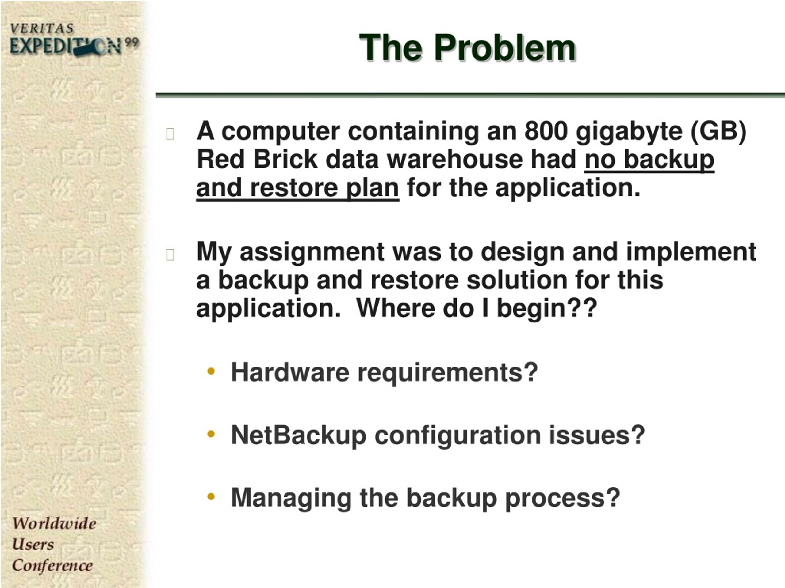 The Problem • A computer containing an 800 gigabyte (GB) Red Brick data warehouse had no backup and restore plan for the application. • My assignment was to design and implement a backup and restore solution for this application. Where do I begin?? • Hardware requirements? • NetBackup configuration issues? • Managing the backup process?