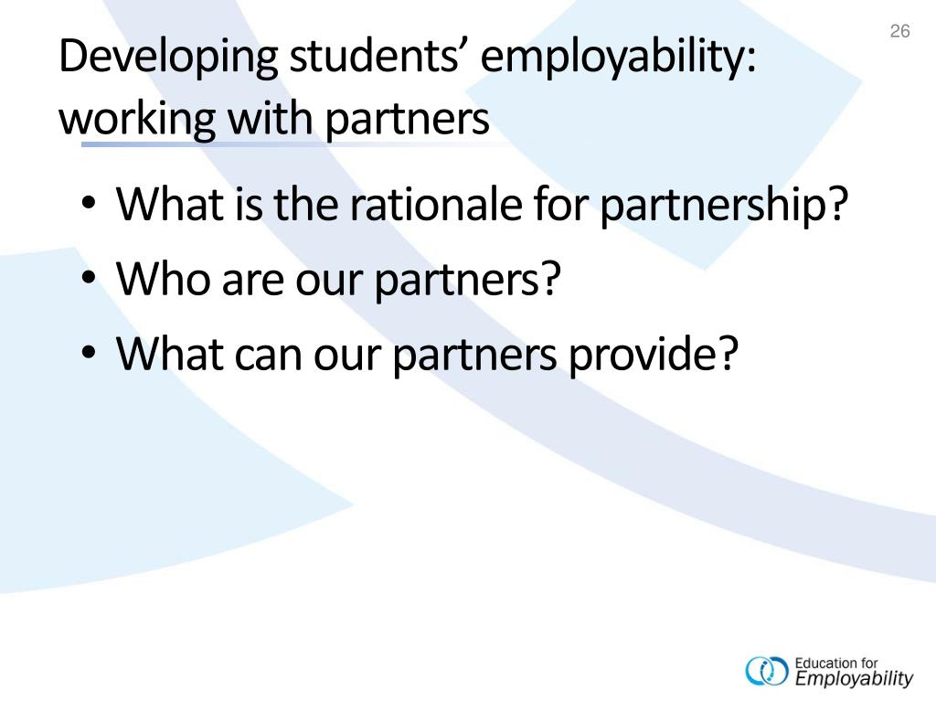 Developing students’ employability:working with partners • What is the rationale for partnership? • Who are our partners? • What can our partners provide?
