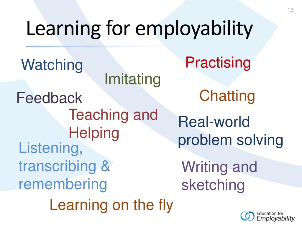 Learning for employability Practising Watching Imitating Chatting Feedback Teaching and Helping Real-world problem solving Listening, transcribing & remembering Writing and sketching Learning on the fly