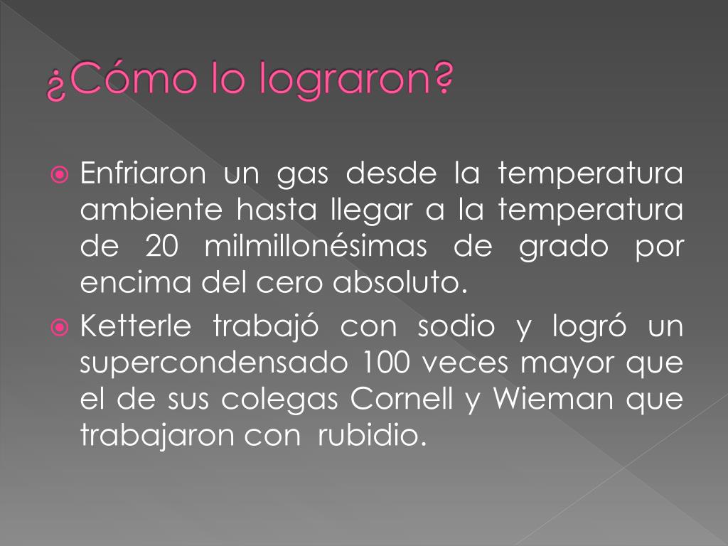 ¿Cómo lo lograron? • Enfriaron un gas desde la temperatura ambiente hasta llegar a la temperatura de 20 milmillonésimas de grado por encima del cero absoluto. • Ketterle trabajó con sodio y logró un supercondensado 100 veces mayor que el de sus colegas Cornell y Wieman que trabajaron con rubidio.