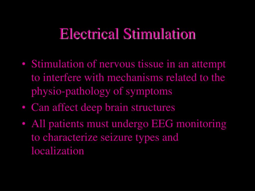 Electrical Stimulation • Stimulation of nervous tissue in an attempt to interfere with mechanisms related to the physio-pathology of symptoms • Can affect deep brain structures • All patients must undergo EEG monitoring to characterize seizure types and localization