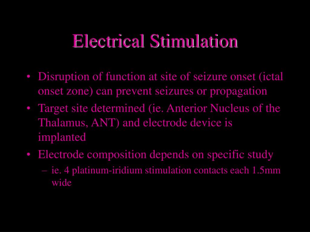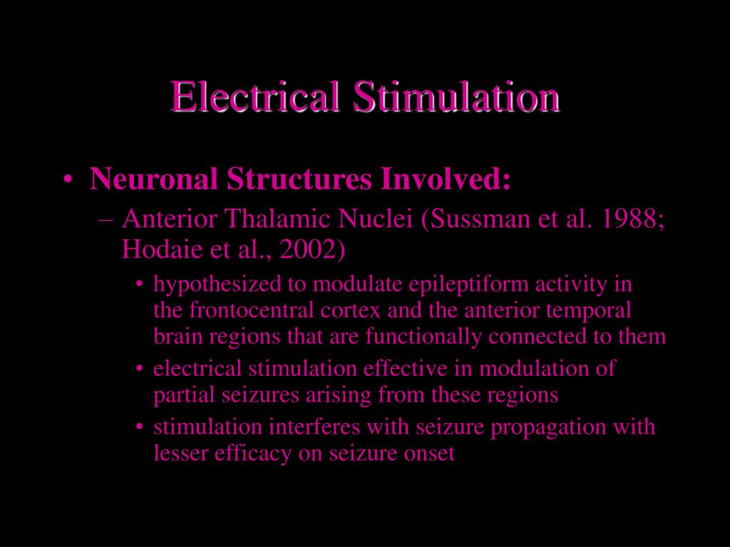 Electrical Stimulation • Neuronal Structures Involved: • Anterior Thalamic Nuclei (Sussman et al. 1988; Hodaie et al., 2002) • hypothesized to modulate epileptiform activity in the frontocentral cortex and the anterior temporal brain regions that are functionally connected to them • electrical stimulation effective in modulation of partial seizures arising from these regions • stimulation interferes with seizure propagation with lesser efficacy on seizure onset
