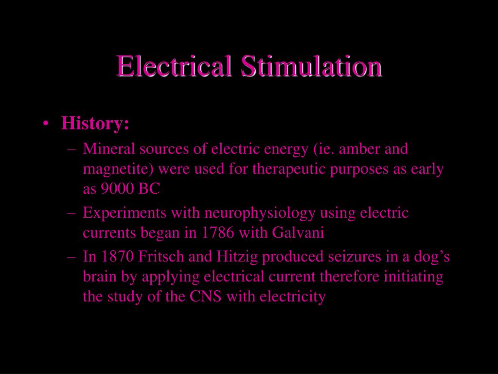 Electrical Stimulation • History: • Mineral sources of electric energy (ie. amber and magnetite) were used for therapeutic purposes as early as 9000 BC • Experiments with neurophysiology using electric currents began in 1786 with Galvani • In 1870 Fritsch and Hitzig produced seizures in a dog’s brain by applying electrical current therefore initiating the study of the CNS with electricity
