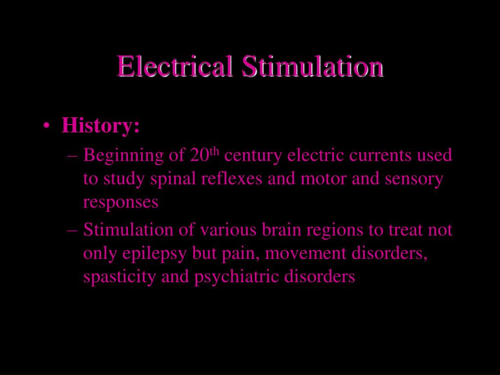 Electrical Stimulation • History: • Beginning of 20th century electric currents used to study spinal reflexes and motor and sensory responses • Stimulation of various brain regions to treat not only epilepsy but pain, movement disorders, spasticity and psychiatric disorders
