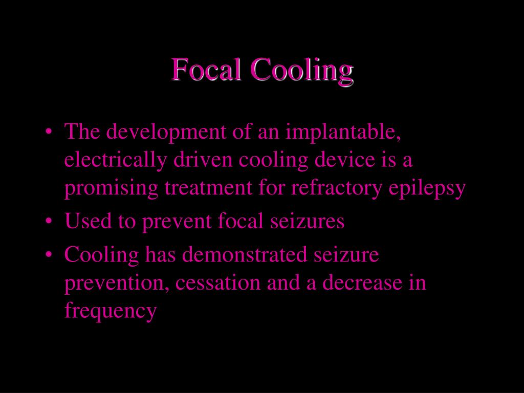 Focal Cooling • The development of an implantable, electrically driven cooling device is a promising treatment for refractory epilepsy • Used to prevent focal seizures • Cooling has demonstrated seizure prevention, cessation and a decrease in frequency