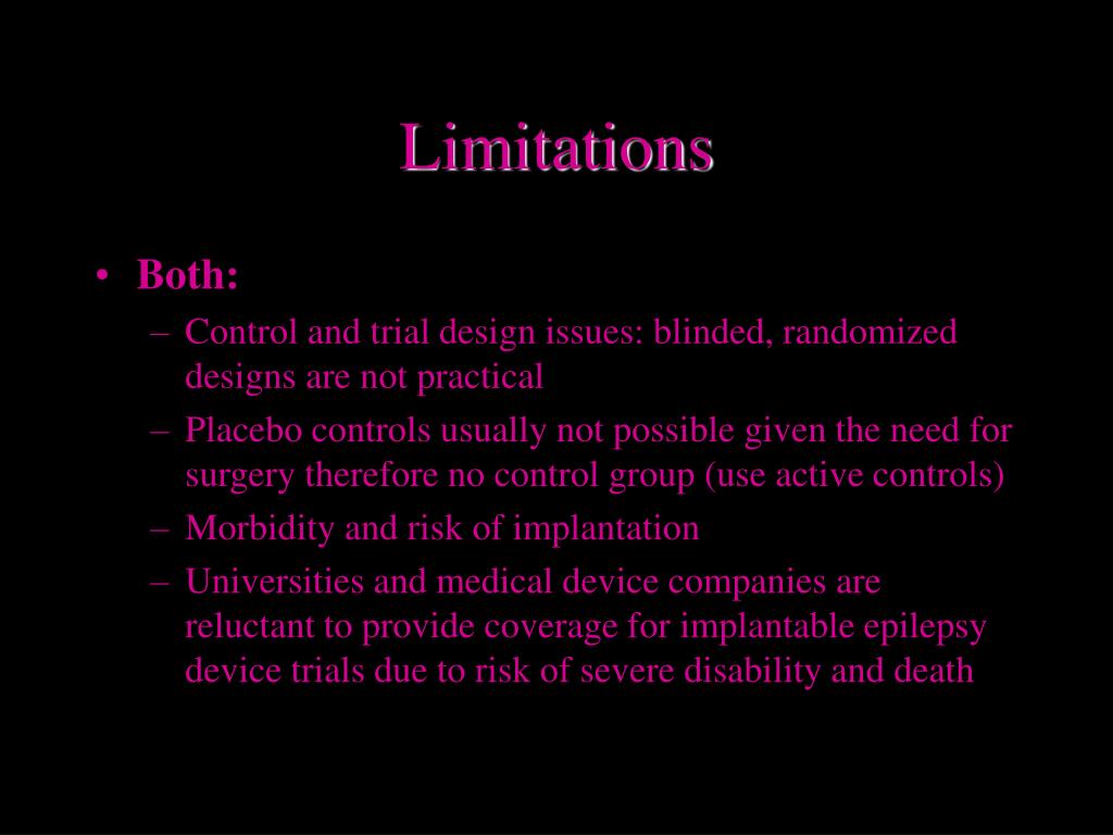 Limitations • Both: • Control and trial design issues: blinded, randomized designs are not practical • Placebo controls usually not possible given the need for surgery therefore no control group (use active controls) • Morbidity and risk of implantation • Universities and medical device companies are reluctant to provide coverage for implantable epilepsy device trials due to risk of severe disability and death