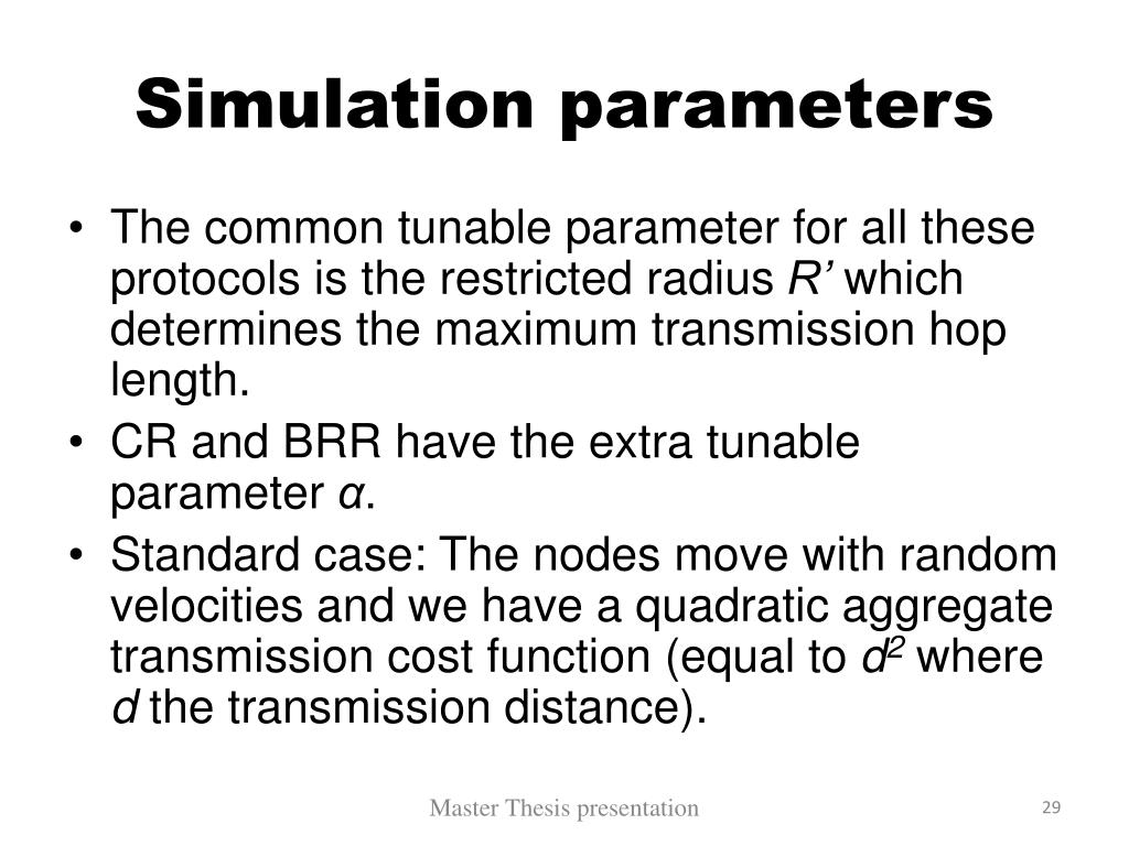 Simulation parameters • The common tunable parameter for all these protocols is the restricted radius R’ which determines the maximum transmission hop length. • CR and BRR have the extra tunable parameter α. • Standard case: The nodes move with random velocities and we have a quadratic aggregate transmission cost function (equal to d2where d the transmission distance). Master Thesis presentation