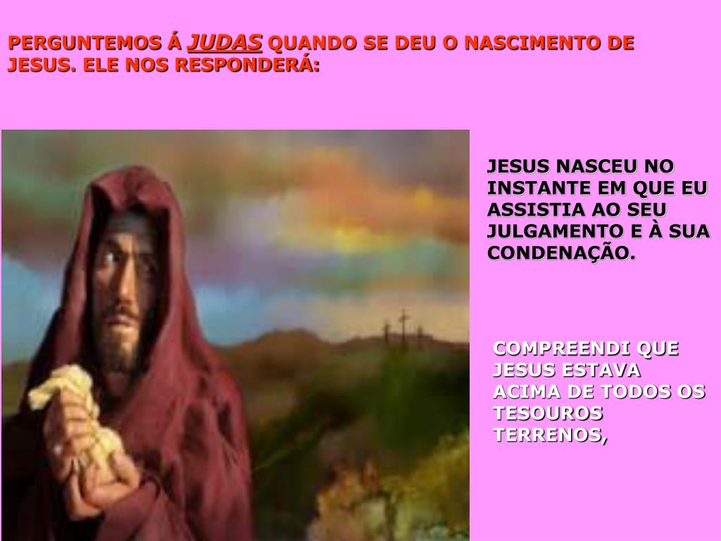 PERGUNTEMOS Á JUDAS QUANDO SE DEU O NASCIMENTO DE JESUS. ELE NOS RESPONDERÁ: JESUS NASCEU NO INSTANTE EM QUE EU ASSISTIA AO SEU JULGAMENTO E À SUA CONDENAÇÃO. COMPREENDI QUE JESUS ESTAVA ACIMA DE TODOS OS TESOUROS TERRENOS,