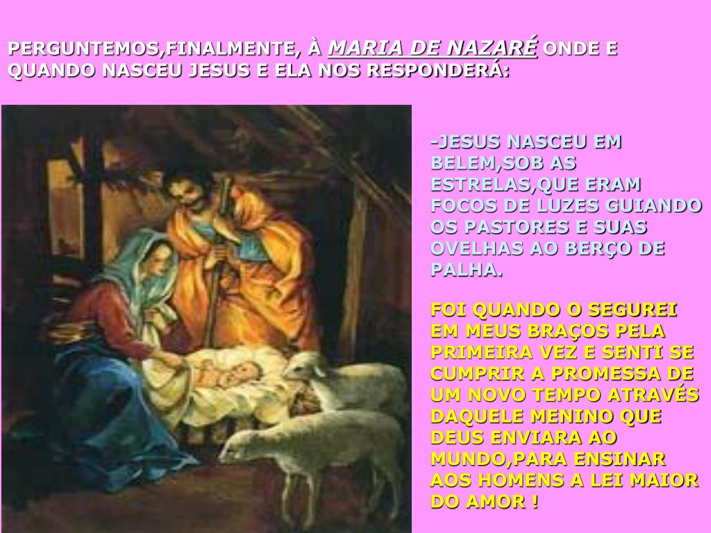 PERGUNTEMOS,FINALMENTE, À MARIA DE NAZARÉ ONDE E QUANDO NASCEU JESUS E ELA NOS RESPONDERÁ: -JESUS NASCEU EM BELEM,SOB AS ESTRELAS,QUE ERAM FOCOS DE LUZES GUIANDO OS PASTORES E SUAS OVELHAS AO BERÇO DE PALHA. FOI QUANDO O SEGUREI EM MEUS BRAÇOS PELA PRIMEIRA VEZ E SENTI SE CUMPRIR A PROMESSA DE UM NOVO TEMPO ATRAVÉS DAQUELE MENINO QUE DEUS ENVIARA AO MUNDO,PARA ENSINAR AOS HOMENS A LEI MAIOR DO AMOR !