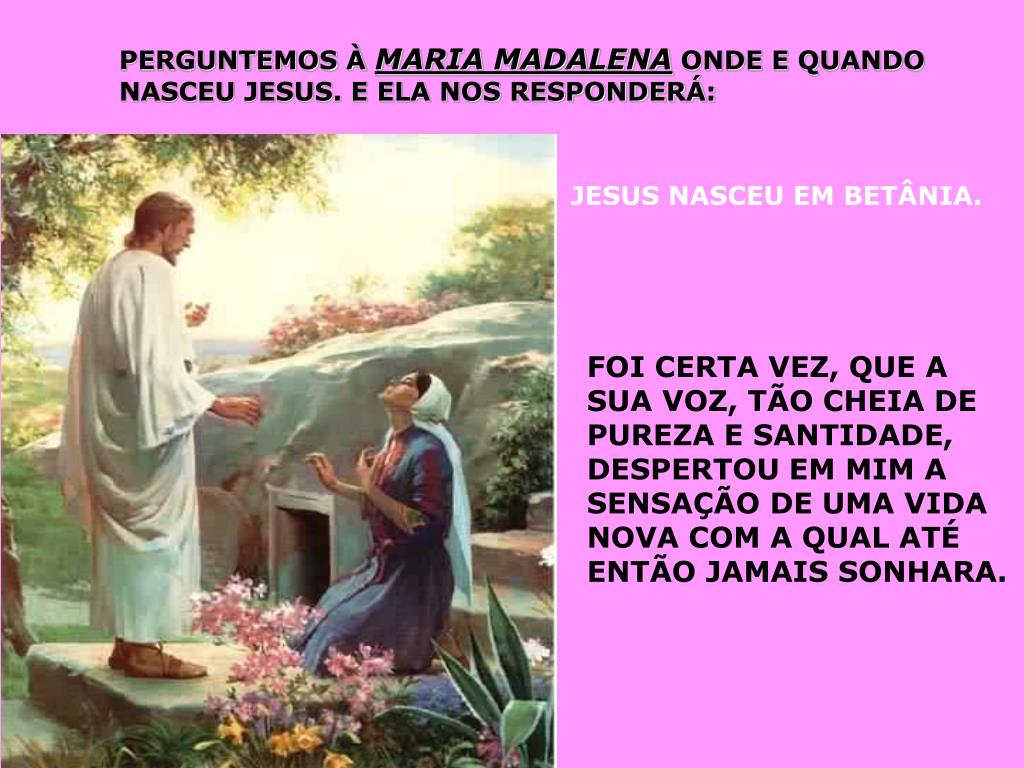 PERGUNTEMOS À MARIA MADALENA ONDE E QUANDO NASCEU JESUS. E ELA NOS RESPONDERÁ: JESUS NASCEU EM BETÂNIA. FOI CERTA VEZ, QUE A SUA VOZ, TÃO CHEIA DE PUREZA E SANTIDADE, DESPERTOU EM MIM A SENSAÇÃO DE UMA VIDA NOVA COM A QUAL ATÉ ENTÃO JAMAIS SONHARA.