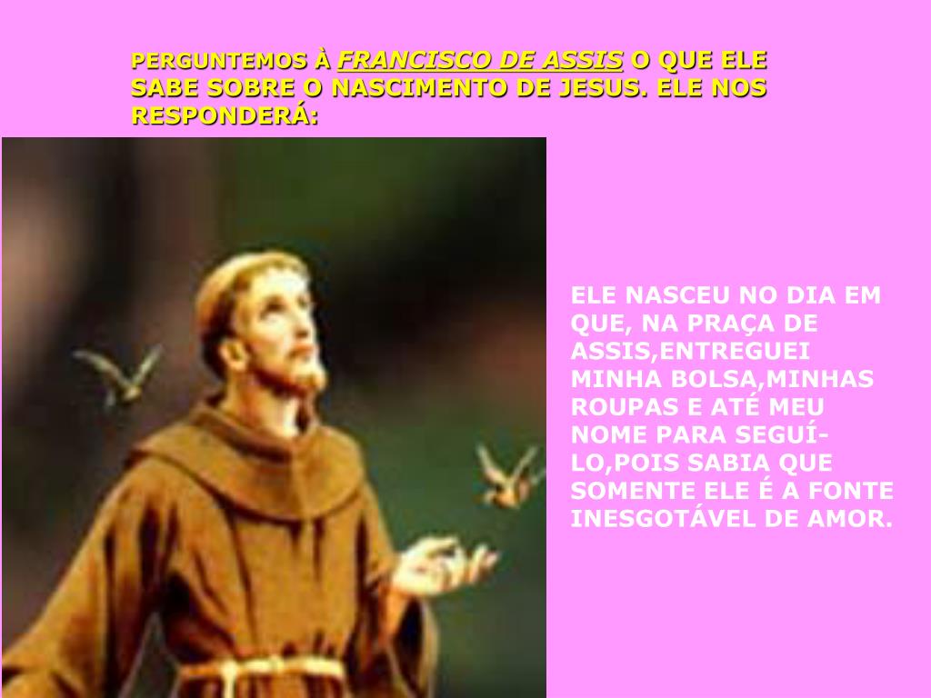 PERGUNTEMOS À FRANCISCO DE ASSIS O QUE ELE SABE SOBRE O NASCIMENTO DE JESUS. ELE NOS RESPONDERÁ: ELE NASCEU NO DIA EM QUE, NA PRAÇA DE ASSIS,ENTREGUEI MINHA BOLSA,MINHAS ROUPAS E ATÉ MEU NOME PARA SEGUÍ-LO,POIS SABIA QUE SOMENTE ELE É A FONTE INESGOTÁVEL DE AMOR.