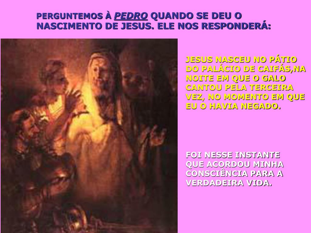 PERGUNTEMOS À PEDRO QUANDO SE DEU O NASCIMENTO DE JESUS. ELE NOS RESPONDERÁ: JESUS NASCEU NO PÁTIO DO PALÁCIO DE CAIFÁS,NA NOITE EM QUE O GALO CANTOU PELA TERCEIRA VEZ, NO MOMENTO EM QUE EU O HAVIA NEGADO. FOI NESSE INSTANTE QUE ACORDOU MINHA CONSCIÊNCIA PARA A VERDADEIRA VIDA.
