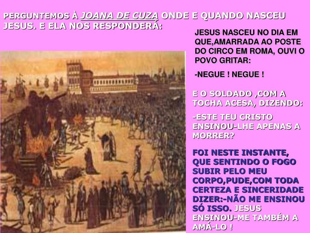 PERGUNTEMOS À JOANA DE CUZA ONDE E QUANDO NASCEU JESUS. E ELA NOS RESPONDERÁ: JESUS NASCEU NO DIA EM QUE,AMARRADA AO POSTE DO CIRCO EM ROMA, OUVI O POVO GRITAR: -NEGUE ! NEGUE ! E O SOLDADO ,COM A TOCHA ACESA, DIZENDO: -ESTE TEU CRISTO ENSINOU-LHE APENAS A MORRER? FOI NESTE INSTANTE, QUE SENTINDO O FOGO SUBIR PELO MEU CORPO,PUDE,COM TODA CERTEZA E SINCERIDADE DIZER:-NÃO ME ENSINOU SÓ ISSO. JESUS ENSINOU-ME TAMBÉM A AMÁ-LO !