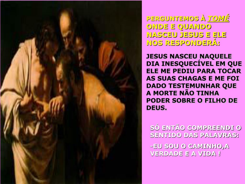 PERGUNTEMOS À TOMÉ ONDE E QUANDO NASCEU JESUS E ELE NOS RESPONDERÁ: JESUS NASCEU NAQUELE DIA INESQUECÍVEL EM QUE ELE ME PEDIU PARA TOCAR AS SUAS CHAGAS E ME FOI DADO TESTEMUNHAR QUE A MORTE NÃO TINHA PODER SOBRE O FILHO DE DEUS. SÓ ENTÃO COMPREENDI O SENTIDO DAS PALAVRAS: -EU SOU O CAMINHO,A VERDADE E A VIDA !
