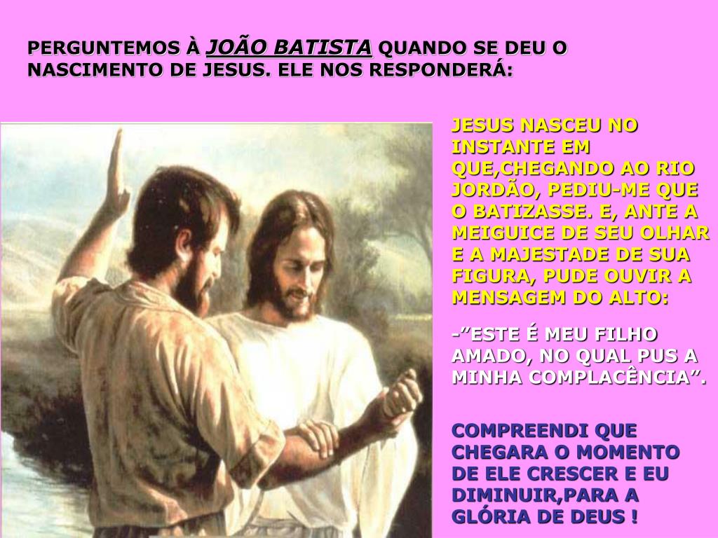PERGUNTEMOS À JOÃO BATISTA QUANDO SE DEU O NASCIMENTO DE JESUS. ELE NOS RESPONDERÁ: JESUS NASCEU NO INSTANTE EM QUE,CHEGANDO AO RIO JORDÃO, PEDIU-ME QUE O BATIZASSE. E, ANTE A MEIGUICE DE SEU OLHAR E A MAJESTADE DE SUA FIGURA, PUDE OUVIR A MENSAGEM DO ALTO: -”ESTE É MEU FILHO AMADO, NO QUAL PUS A MINHA COMPLACÊNCIA”. COMPREENDI QUE CHEGARA O MOMENTO DE ELE CRESCER E EU DIMINUIR,PARA A GLÓRIA DE DEUS !
