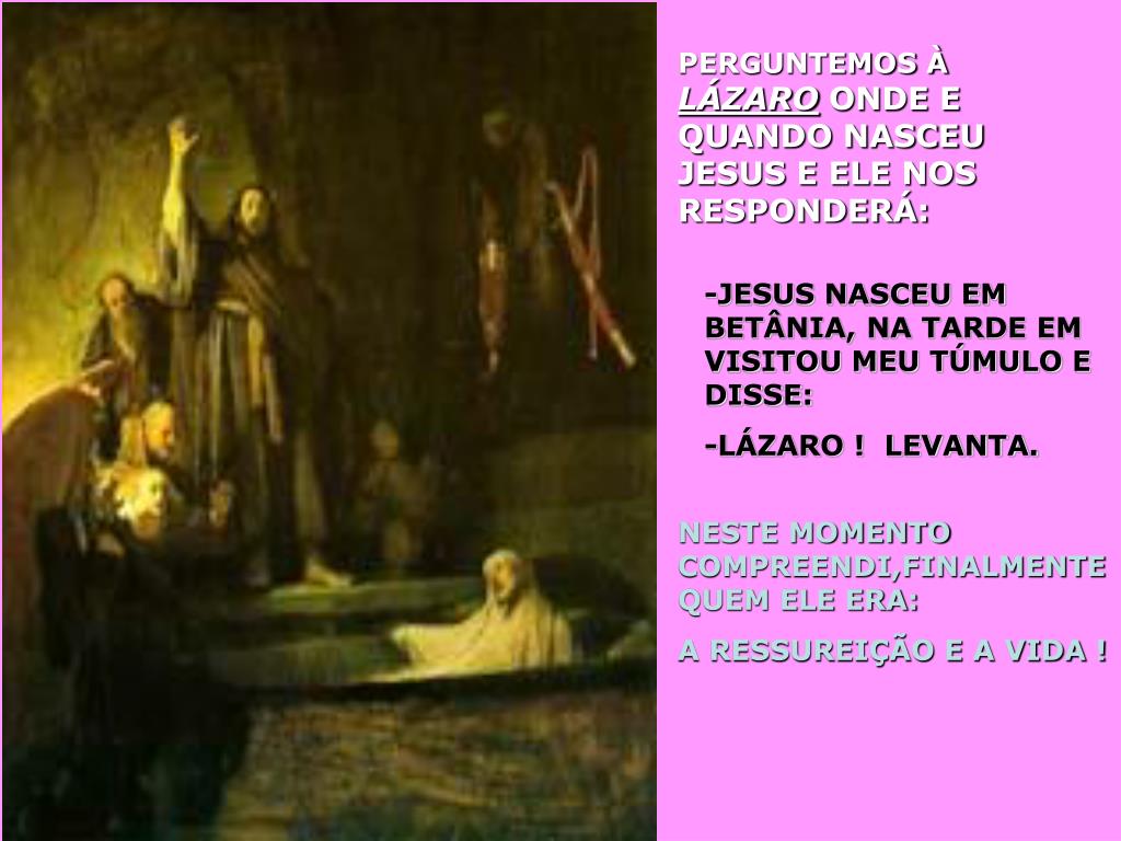 PERGUNTEMOS À LÁZARO ONDE E QUANDO NASCEU JESUS E ELE NOS RESPONDERÁ: -JESUS NASCEU EM BETÂNIA, NA TARDE EM VISITOU MEU TÚMULO E DISSE: -LÁZARO ! LEVANTA. NESTE MOMENTO COMPREENDI,FINALMENTE QUEM ELE ERA: A RESSUREIÇÃO E A VIDA !