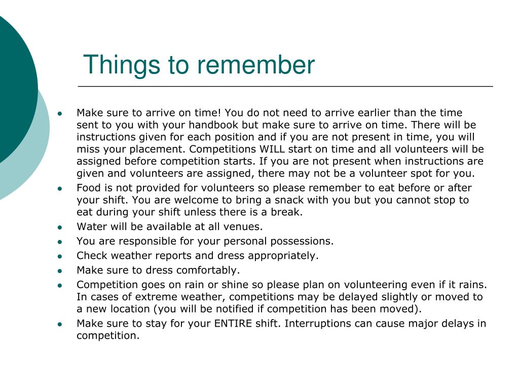 Things to remember • Make sure to arrive on time! You do not need to arrive earlier than the time sent to you with your handbook but make sure to arrive on time. There will be instructions given for each position and if you are not present in time, you will miss your placement. Competitions WILL start on time and all volunteers will be assigned before competition starts. If you are not present when instructions are given and volunteers are assigned, there may not be a volunteer spot for you. • Food is not provided for volunteers so please remember to eat before or after your shift. You are welcome to bring a snack with you but you cannot stop to eat during your shift unless there is a break. • Water will be available at all venues. • You are responsible for your personal possessions. • Check weather reports and dress appropriately. • Make sure to dress comfortably. • Competition goes on rain or shine so please plan on volunteering even if it rains. In cases of extreme weather, competitions may be delayed slightly or moved to a new location (you will be notified if competition has been moved). • Make sure to stay for your ENTIRE shift. Interruptions can cause major delays in competition.