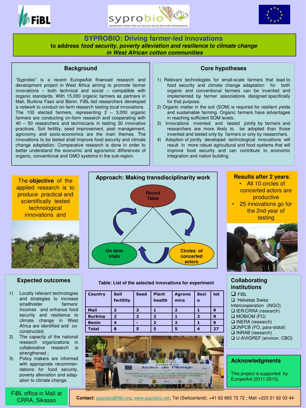 Syprobio is a EuropeAid-financed project empowering organic farmers in West Africa to develop innovations for food security, poverty alleviation, and climate resilience. Researchers collaborate with farmers to test local innovations in soil fertility, seed improvement, pest management, and more. This transdisciplinary approach aims to enhance smallholder farmers' incomes and strengthen food security in the region. Contact syprobio@fibl.org for more information.