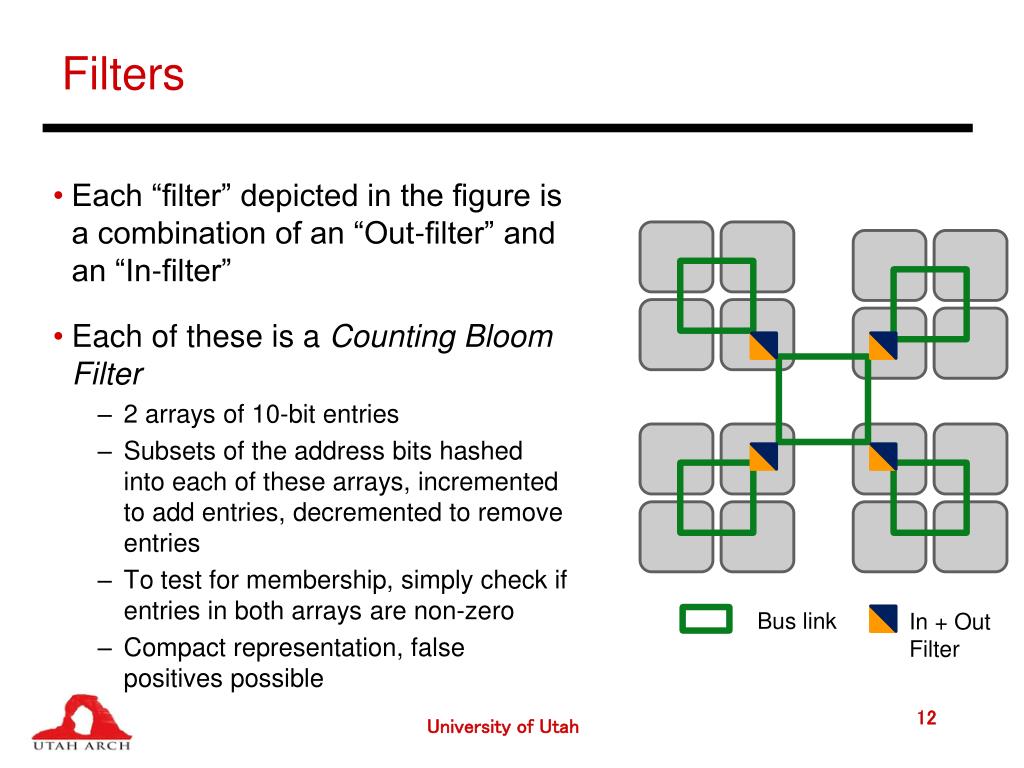 Filters Bus link In + Out Filter • Each “filter” depicted in the figure is a combination of an “Out-filter” and an “In-filter” • Each of these is a Counting Bloom Filter • 2 arrays of 10-bit entries • Subsets of the address bits hashed into each of these arrays, incremented to add entries, decremented to remove entries • To test for membership, simply check if entries in both arrays are non-zero • Compact representation, false positives possible University of Utah