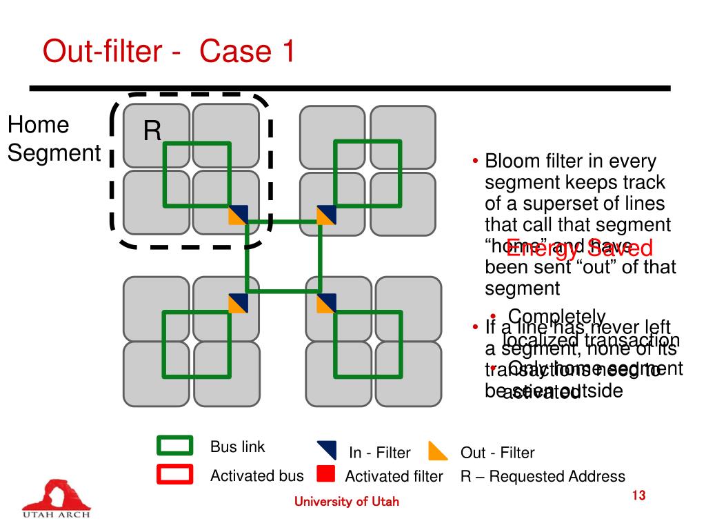 In-filter • Bloom filters keep track of a superset of lines currently present in the segment • Only broadcast within the local segment if required R Energy Saved R R Bus link In - Filter Out - Filter Activated bus Activated filter R – Requested Address University of Utah